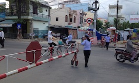 踏切が開いたら一斉にバイクが進入。あ、ベトナムはバイクは右側通行、手前の何台かは完璧な逆行ですな。